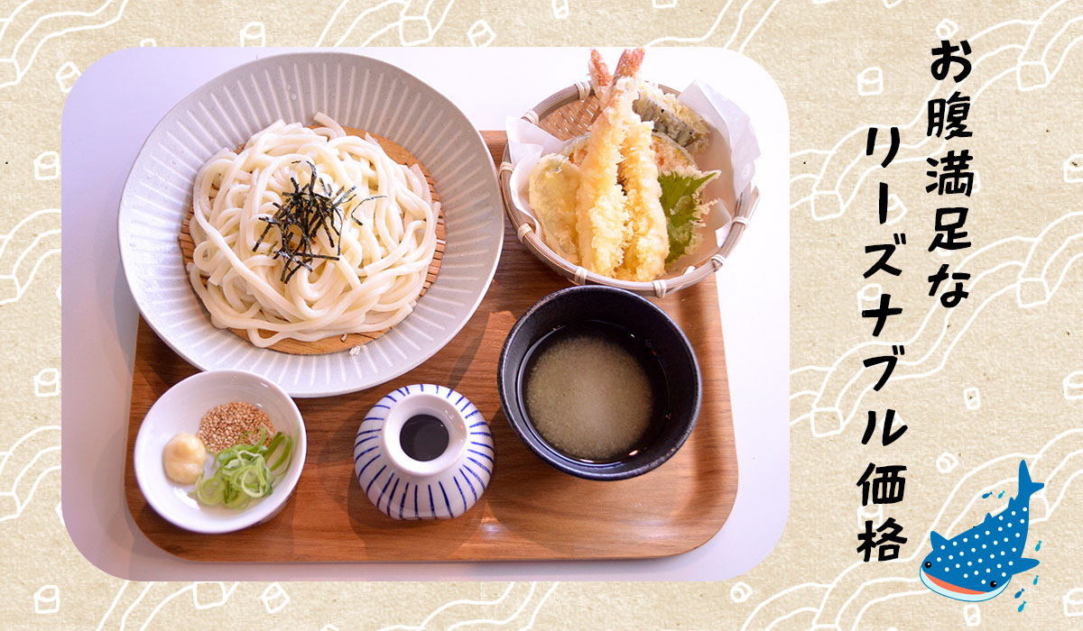 うどんは850円~、かすうどんも980円と観光地の中では良心的な価格。海老2尾に旬野菜がのった天丼は、ボリューム満点で1200円。安くてお腹いっぱい、観光ついでの食事にもぴったりなお店です。